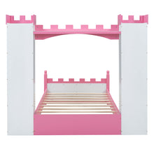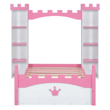 Twin Size Castle Wooden Bed with Bookcase for Kids Bedroom, White+Pink