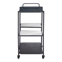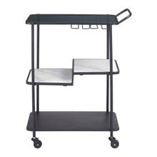 Introducing the Constanza Bar Cart: A harmonious blend of form and function. This sleek black bar cart features a robust steel frame, tempered glass shelves, and luxurious marble accents. Its minimalist design effortlessly complements any interior, from modern to classic. Effortless mobility is guaranteed with smooth-rolling casters, and a locking mechanism adds stability. Beyond its role as a stylish bar cart, it's a versatile piece that adapts to your needs, whether as a coffee station, storage solution, or chic display unit. Elevate your entertaining and decor with the Constanza Bar Cart today.
