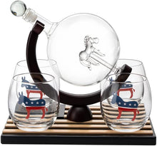 - BEAUTIFUL SET: This is a hand blown glass decanter with a detailed donkey symbol head on the inside, and 4 hand painted whiskey glasses. This set includes 1 decanter, 4 Democratic whiskey glasses, and a set of 8 whisky stones. Show off your political pride with this beautiful Democratic Decanter Set!