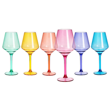- This colored wine glass set is a perfect way to add some pizzazz and fun to your party or celebratory event. Be sure to add these to your next pool party, or outdoor soiree; they’re easy to clean after the big day. Whether you're hosting a party or need something to decorate your home with, these colored wine glasses will be perfect. These cups are durable enough to last a lifetime, but also look great as art in your home decor.