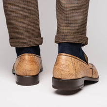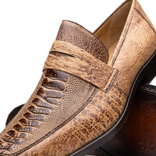The FANGIO is our classic penny loafer with an exotic twist. It features genuine ostrich leg and ostrich quill, a unique hand finish, easy slip-on application, and a full leather outsole. Dress these up with your favorite jeans, slacks, or shorts for a sophisticated look.