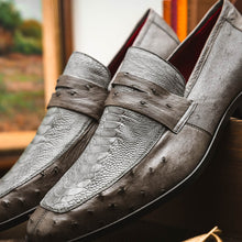 The FANGIO is our classic penny loafer with an exotic twist. It features genuine ostrich leg and ostrich quill, a unique hand finish, easy slip-on application, and a full leather outsole. Dress these up with your favorite jeans, slacks, or shorts for a sophisticated look.