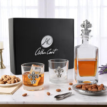 Introducing the Stylish Fleur De Lis Design Glass Decanter Set by Arthur Court, a must-have for every elegant party. This decanter set from the Arthur Court Fleur De Lis Collection embodies sophistication and luxurious entertaining. Expertly crafted from high-quality glass and aluminum, the decanter set offers an exquisite statement piece for your collection. Also recognized as a luxury wedding gift, this decanter set ensures a memorable impression. Whether you're hosting a cocktail party or enjoying a quiet night in, elevate your experience with this fanciful glass decanter set.