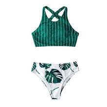 Green Stripe And Leaves Print Bikini Sets Women Tank Swimsuit Women's Two Piece High Neck Bikinis Swimsuits Modest Crop Top Bathing Suits For Teens Two Pieces Girls Beach Bathing Suits Swimwear