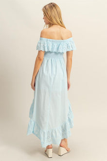 High-Low Eyelet Ruffled Off-Shoulder Dress For Summer – Fluttering, Flirty and Feminine Off-Shoulder Dress with Eyelet Detailing and High-Low Hem