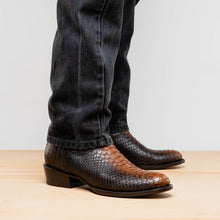 The KANSAS boot is a bold expression of authentic Western heritage elevated by luxury craftsmanship. Expertly handcrafted using genuine Python skin for the vamp and rich full-grain leather on the shaft, this piece delivers timeless cowboy attitude with a refined and modern edge. The contrast stitching and signature red interior lining add a distinctive flair—designed to turn heads whether you're on the ranch or the city streets.