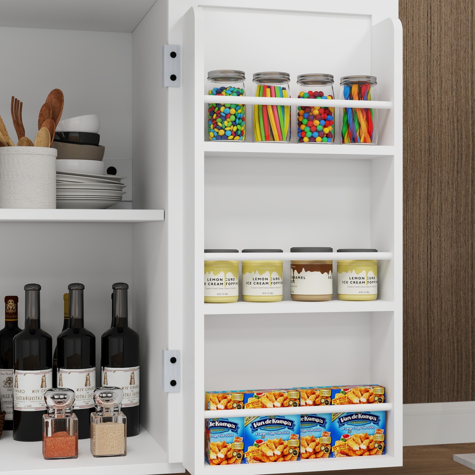 Ample Storage Space:The 6 storage compartments behind the side door and 2-tier shelves of this storage organizer give you plenty of room for drinks, canned food, dry goods or containers.