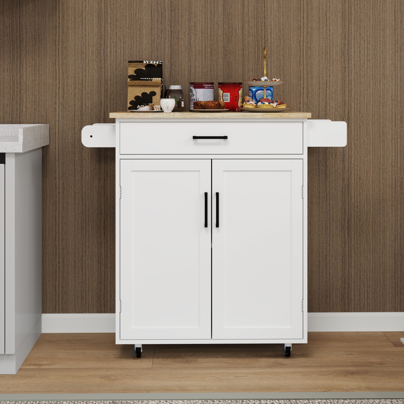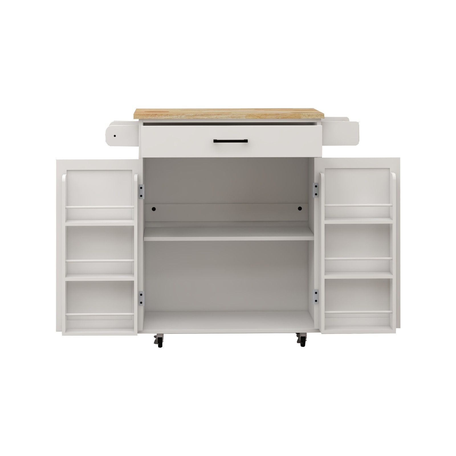 Extra towel and seasoning space: There are towel rack and seasoning rack on both sides of this white kitchen island. You can easily pick up kitchen towels or seasonings, and when you move the cart, it can also be used as a handle.