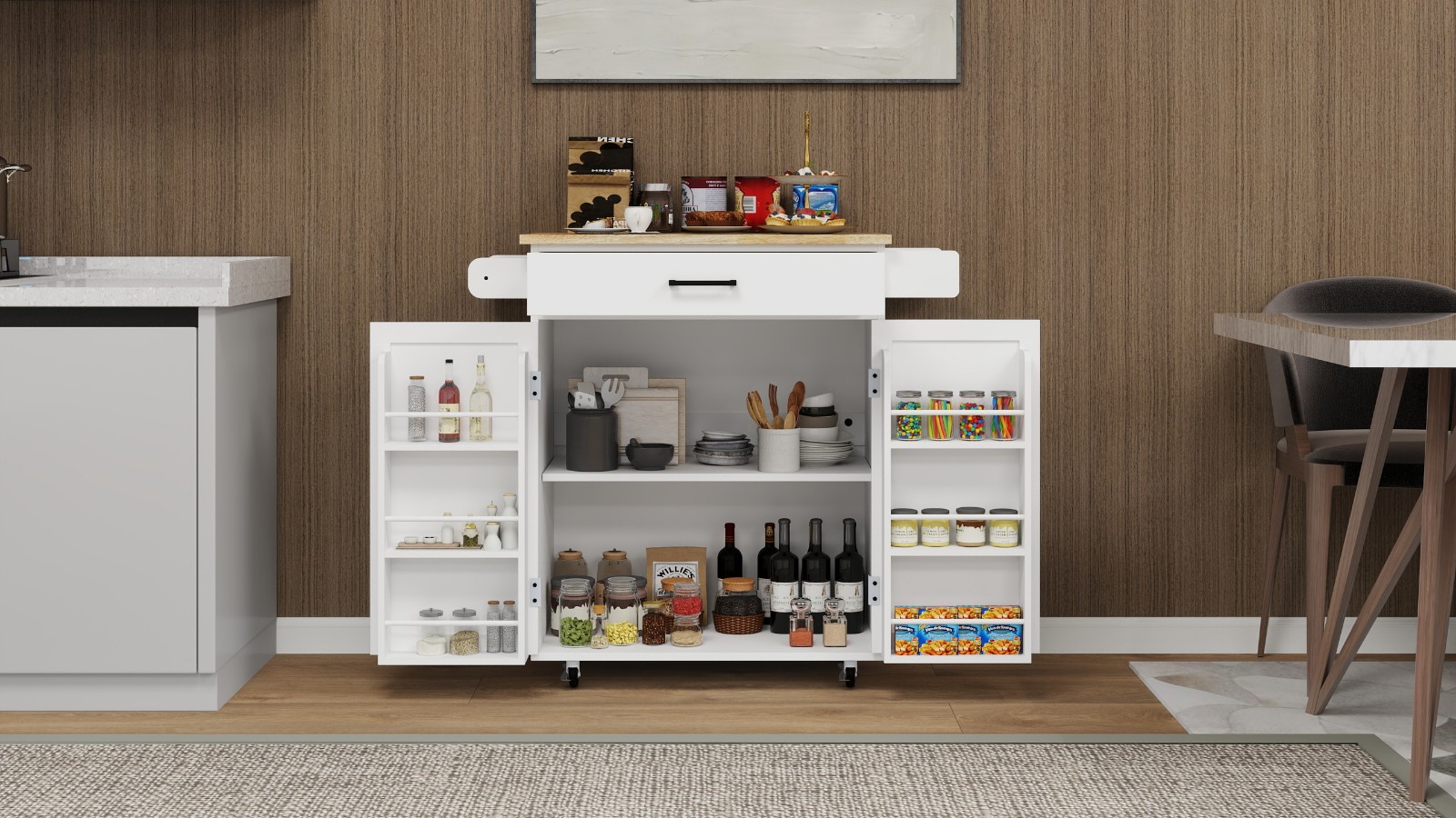 Versatility: The kitchen island with rubber wood table top is designed with drawers that can be pulled out, which are located on the fully extended metal slide rail, providing hidden storage for silverware and napkins. The wheels can facilitate the movement around the kitchen, and the casters can be locked for fixed positioning.