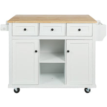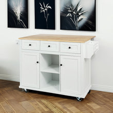 Kitchen trolley with rubber wood leaf countertop, 5-wheel kitchen island, storage cabinet and 3 dining drawers, white