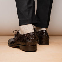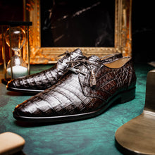 The LACIO is our fully wrapped genuine caiman crocodile dress derby's featuring tasseled laces and a polished hand finish that makes the crocodile texture pop. Dress these up with your favorite jeans or slacks for a stunning look.