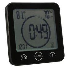 - WATERPROOF FOR SPLASHES- Ip24 protection from any direction and from touch by fingers. Suitable for most locations, perfect for use in bath room, shower and kitchen areas with a splash proof rating. Essential to use above the bath, vanity or kitchen sink as a timer, even in the shower to keep track of time and save water. Avoid placing clock directly in front of heavy water spray. Updated design with Low Battery Indicator will appear on Lcd screen when battery power lower than 2.75v.