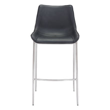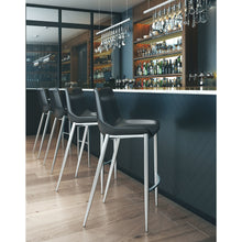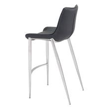 High design meets everyday casual. This handsome barstool with its slim profile pulls up perfectly to the bar. Its super comfortable curved seat is covered in black faux leather with dramatic stitching. Brushed Stainless Steel legs are complete with protective plastic feet to keep your floors scratch-free.