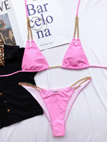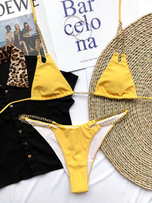 - UNIQUE FEATURE- Triangle 2 pieces bikini set,low rise thong bikini bottoms,minimal coverage,removable padded push up bra,underwire,unique metal chain strap design,front brooch can be rotated off.