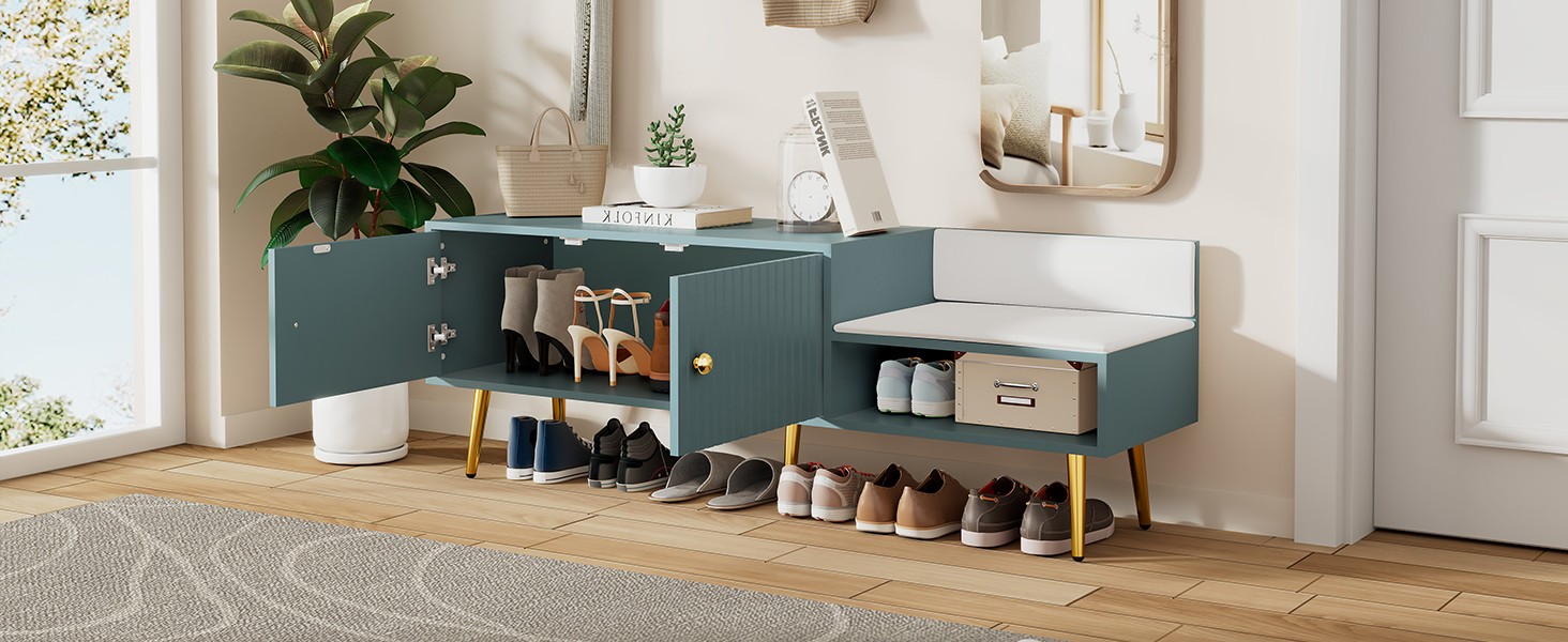 Stunning Details: This modern storage bench of clean lines going with any environment is a sleek and functional addition to any contemporary space. Crafted with sophistication in mind, this bench features metal handles and metal legs, adding a touch of industrial flair to its design. The door panels are intricately carved with grooves, enhancing its visual appeal and creating depth and texture. Perfect for storing shoes or other essentials, this bench seamlessly combines style and practicality.