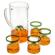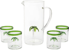 - Bring color and texture to your table with this palm tree themed glassware set! Pour your favorite beverage into the tall green rim glasses, and raise a toast to good friends. Superb quality with a heavy feel, crafted from borosilicate glass. Inspired by the orante succulent plants, this pitcher set will make an exquisite statement at your next gathering. The beautiful green coloring is vivid against the light green colored rim, making this pitcher and glass set both eye catching and functional
