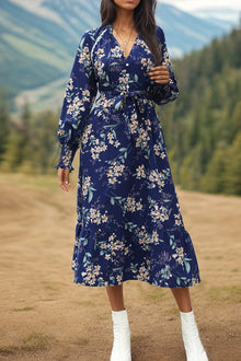 - Color:Dark Blue- Style: Dress- Pattern Type: Floral- Sleeve Length: Long Sleeve- Neckline: V-Neck- Waist: High Waist- Length: Midi Dress- Material: Polyester- Closure: Zipper- Fit: Slim Fit- Details: Ruffles- Occasion:...