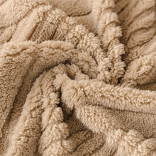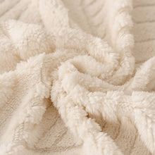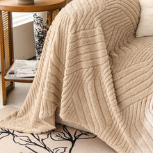 This furniture throw is constructed from a solid plush fleece. The fabric surface features a distinct, three-dimensional pattern of interlocking geometric lines. This textured design adds visual interest, while the material's thickness provides a protective layer for furniture and adds extra warmth. As a drape-on cover, it is designed for versatile placement across sofas, beds, and other furniture without the need for structured fitting.