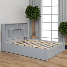 This storage platform bed is simple and fashionable. The headboard features 4 shelves, with 2 drawers, offering you convenient storage space for daily necessities. The whole construction is made of solid wood and MDF, so it's designed for long-term use.