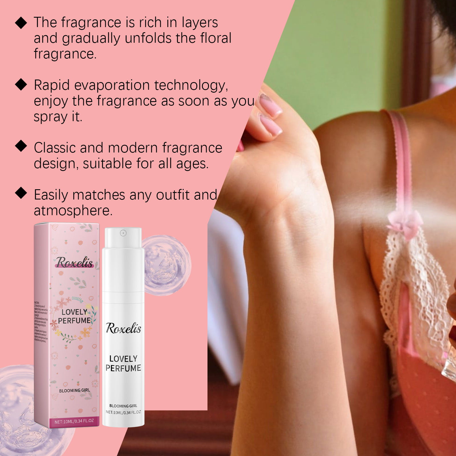 Our Raspberry Spin Perfume spray contains vanilla fruit extract and rose oil. It can provide a lasting raspberry fragrance and enhance personal temperament. Its use method is very simple: take a proper amount of this product, evenly spray on the wrists, behind the ears, neck and other places that need fragrance. It also provides natural sweetness and antioxidant protection.、