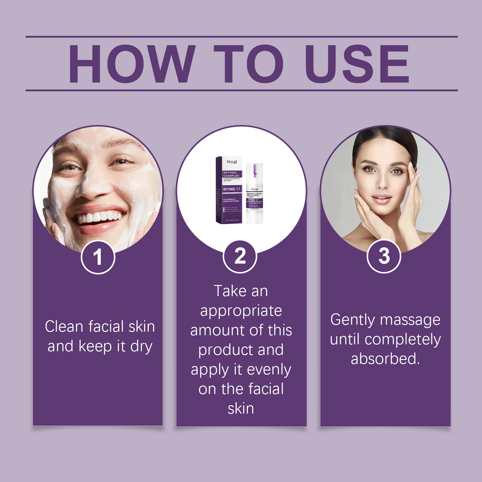 Our retinol face serum contains vitamin E (tocopherol), glycerin. It traps moisture deep into the skin, providing lasting moisture and leaving the skin looking fuller and healthier. It locks moisture deep into the skin, providing lasting moisture and leaving the skin looking fuller and healthier. Its application method is very simple: clean the facial skin to keep the skin dry, apply appropriate amount of this product evenly on the facial skin, gently massage until completely absorbed. And the packaging design is simple, easy to use, suitable for travel.