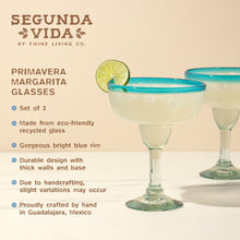 Striking stemmed cocktail glasses are essential for serving margaritas. This blue rimmed margarita glass set celebrates the art and traditions of Mexican artisans and is hand blown from recycled glass.
