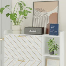 This shoe cabinet is perfect for your entryway, hallway, living room, or porch. With 3 flip doors, it provides hidden storage for your shoes while maintaining a modern and rustic design. The carved arrow detailing in rustic light brown and white gold complements any home style. Keep your home neat and save space with this stylish shoe cabinet.