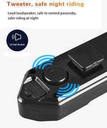 - WIRELESS REMOTE CONTROL AND 5 MODES: With 3 easy-to-use buttons on the wireless controller, the bicycle tail light can be remotely controlled to send signals in 5 different modes. Include turn right + high decibel speaker, turn left + high decibel speaker, red light always on, red light flashing and all flashing. You can change different modes according to your needs and occasions, effectively reminding passing vehicles.