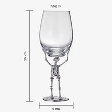 - Terrify and delight your guests when you dress up your next party with the Stemmed Skeleton Wine Glasses that each hold 19 oz of your favorite wine. Your wine will be even more delicious in these spooky glasses. A skeleton is depicted in an elegant form standing tall below your favorite wine in a silver finish. These glasses are designed to spook your guests, your visitors and yourself when you look at them. The skeleton wine glass set is sure to be an eerie addition to any occasion