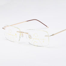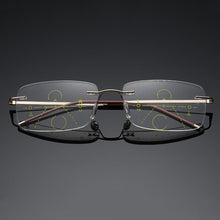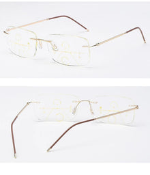 - HEALTHFUL AND COMFORTABLE READING GLASSES - Rimless frame reading glasses, lightweight comfortable and no pressure to wear the glasses; Intelligent progressive multifocal lens give the best experience. suitable for reading and looking at distant objects without frequent picking, Perfect for reading and outdoor distance viewing, Blue light blocking lenses protect eye health
