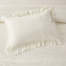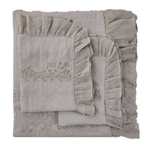 Our Tabitha Linen duvet cover set is casual elegance at its finest. Handcrafted with a linen applique overlay, crochet and pleat detailing, and a voile ruffle border, this duvet set is simply incredible. Linen is breathable, durable and softens with every wash.