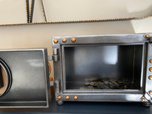 Ship Cabin Door Style Metal Table Clock with Piggy Bank – a unique fusion of nautical charm and functional design. Handcrafted with meticulous attention to detail, this clock seamlessly blends the rustic allure of ship cabin doors with the practicality of a piggy bank, all while boasting a dollar sign clock face for added character.