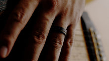 Material: Brushed Black Tungsten Carbide and yellow gold guitar string inlay