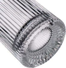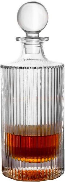 This whiskey decanter features a sleek, cylindrical shape with a vertical ribbed texture that adds elegance and sophistication to its design. The clear glass construction showcases the contents beautifully, making it a stunning centerpiece on any bar or table. Topped with a perfectly rounded glass stopper, it provides an airtight seal to preserve the flavor and quality of the whiskey or other spirits stored inside. The decanter’s modern yet classic design complements a variety of settings, ideal for both functional use and display.