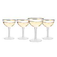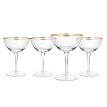 - Add a special touch to your celebration with this set of 4 gold rimmed champagne coupe glasses. The champagne coupe is widely considered to be the most romantic of drinking vessels. So you and your friends are celebrating the special event of a life time. Make it extra special by adding these 4 vintage gold rimmed champagne coupe glasses to the mix! Whether you're sharing a bottle of champagne, wine or cocktails, these classy glasses are sure to impress your guests.
