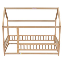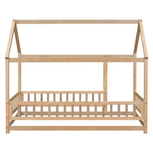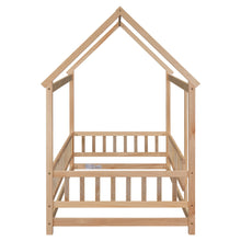 Twin Size Floor Wooden Bed with House Roof Frame, Fence Guardrails,Natural