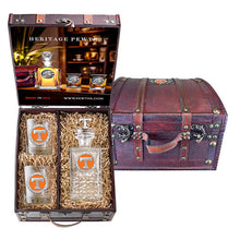 University of Tennessee Heritage Decanter with 3D Top Power T and 2 Glasses with Chest Box