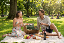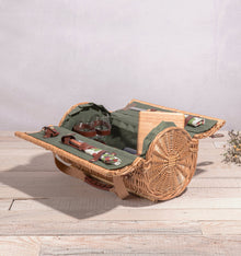 What could be fairer than the Verona Wine & Cheese Picnic Basket? Why, the Verona filled with all your favorite wine, cheese, and charcuterie, of course! This handwoven wicker picnic basket is worthy of your finest sonnet. A classic English-style wine basket, this compact yet roomy willow barrel contains everything you need for wine and cheese picnic for two. Picnic set includes 2 wine glasses, silverware set for 2, wood cutting board, wood-handled cheese knife, a nickel-plated cork bottle stopper, and waiter-style corkscrew. The durable polyester lining and cotton napkins come in matching colorways for vintage-style flair. Grab the canvas carry straps with leatherette details and take this wine picnic basket on your next romantic adventure - or gift it to a favorite couple for weddings, anniversaries, or other special occasions.