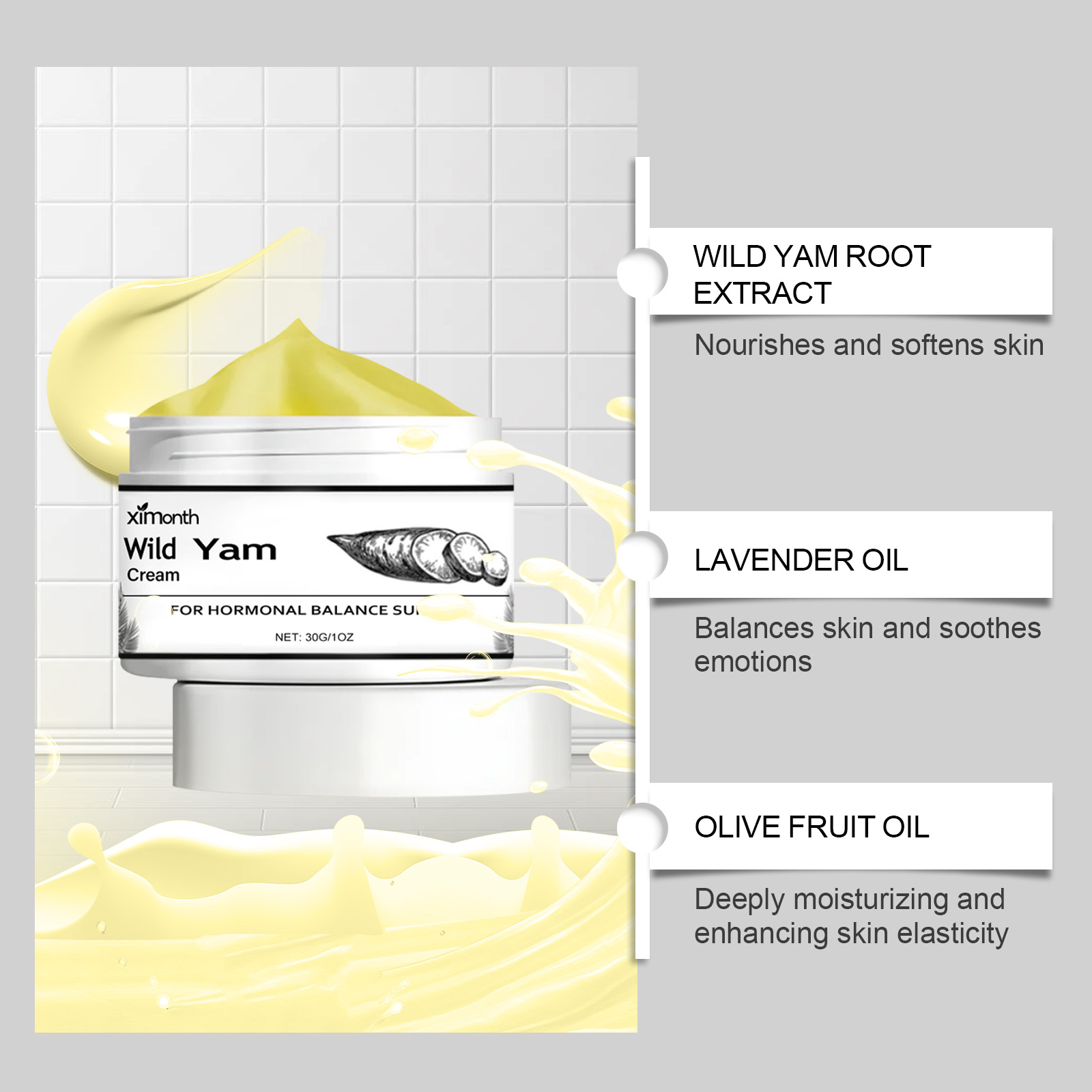 Our yam cream contains wild yam root extract, lavender oil, olive oil. It nourishes and softens the skin; Balance skin, soothe mood; Deep moisture, enhance skin elasticity. Its use method is very simple: 1. Clean the body skin, keep dry; 2. Apply appropriate amount to face, neck and chest. Abdomen, arms or inner thighs; 3. Gently massage until fully absorbed. Light texture, fast absorption, non-greasy, relieve menstrual discomfort, regulate the rule, maintain health.