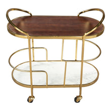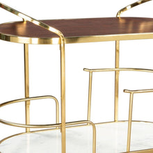32" Brown Gold And White Iron Solid Wood and Marble Oval Rolling Bar Cart