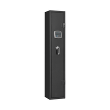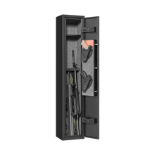 This gun safe can hold 4-5 rifles, with 2 magazines and 2 pistol pockets on the door to hold bullets and pistols, exterior dimensions: 51.9"H x 9.8" x 8.6".