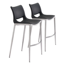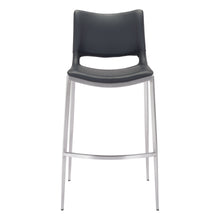 Built for comfort, this ergonomic barstool is the perfect solution for your home or office space. A brushed Stainless Steel frame plays a supporting role while the built-in curved footrest keeps you firmly planted. The black faux leather seat deck is sleek and modern, making this barstool the perfect compliment to any room setting.