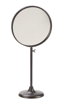 Add a sophisticated industrial touch to your vanity or dresser with this adjustable mirror. The burnished brown piece is adjustable from 19" tall up to 25". This piece is perfect for your makeup, hair styling, and shaving needs. Use this versatile piece on dressers, desks, and vanities. The burnished dark brown finish and modern center piece creates a bold, sophisticated atmosphere. The mirror does not have any magnification and does not tilt.