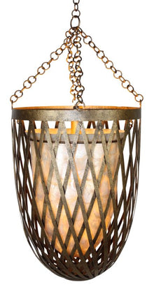 Capiz Chandeliers give a warm glow when lit Crafted with elegance and durability, this antique gold pendant chandelier from Delamere Design features handcrafted iron and Capiz shell for a warm...