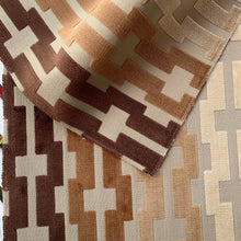 Made of a high-density Belgian quality cut velvet upholstery fabric featuring a square zigzag designer pattern. The plush velvet is raised on top of the fabric.