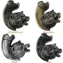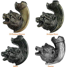 Bring a true wildlife theme into your home or cabin with our Bear with Claw Cabinet Knob. It features a grizzly bear head resting on a claw. The beautiful detail of this knob is sure to add rustic character to your cabinets. This cabinet knob features a cast, one piece construction that has a finish that will outlive your cabinets. Available in four finishes: Oil Rubbed Bronze, Antique Brass, Pewter, and Black.