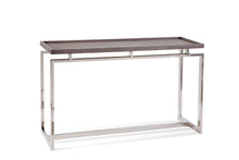 The Beckford console table features tray-top styling with a chrome base. Finishes are grey oak and chrome.