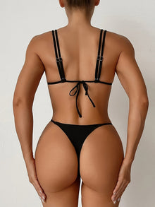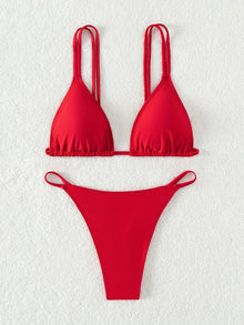 - SEXY TRIANGLE DESIGN – This stunning bikini set features a minimalist solid color with a sleek triangle V-neck top and a modern V string bottom. The lace-up double strap tie back detail enhances adjustability and adds a flirty, fashionable finish.