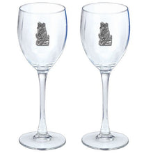 This is a set of two 12 ounce glass goblets with a fine pewter logo medallion bonded to the side. It could be used to serve water, wine or other beverages. Made in USA.