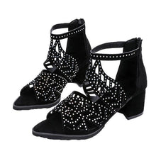 Black Luxury Style Women Summer Sandals Hollow Out Leather Rhinestones Thick Heel Zipper Sandals Beach Sandals Rhinestone Hollow Out Non Slip Breathable Casual Rhinestone Summer Fashion Comfy Sandals